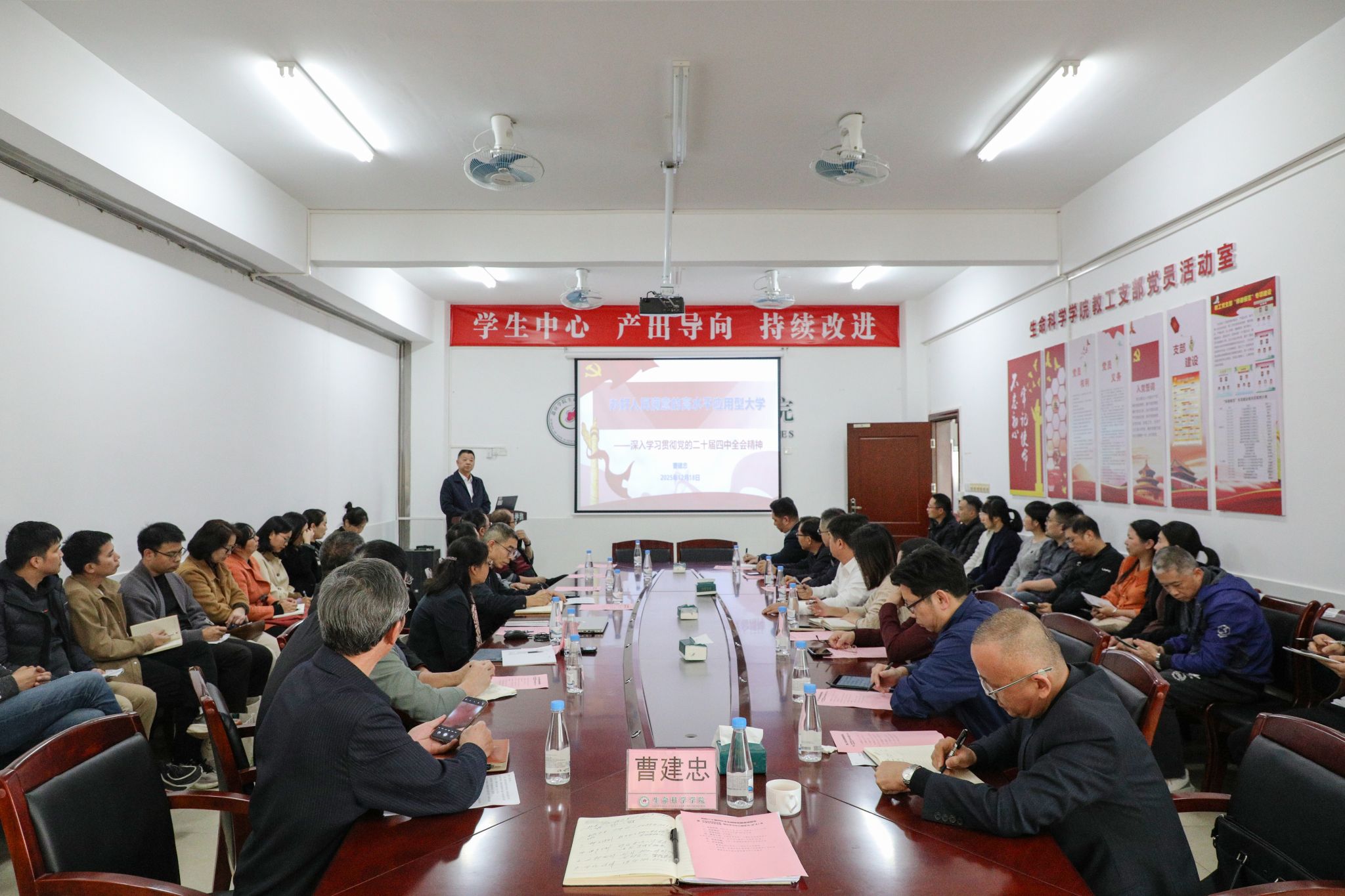 为深刻把握党的二十届四中全会精神的科学内涵,精准锚定学校“十五五”发展方向,凝聚推动学校高质量发展的强大合力,12月18日下午,学校校长曹建忠教授在百年纪念大楼504室作题为《办好人民满意的高水平应用型大学——深入学习贯彻党的二十届四中全会精神》的专题宣讲报告。生命科学学院、计算机学院党政班子、党支部书记及委员、系(室)主任及教师代表参加此次学习会。